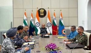 रक्षा मंत्री राजनाथ सिंह ने शुक्रवार को रक्षा मंत्रालय में एक बेहद महत्वपूर्ण मीटिंग की। इस बैठक में चीफ ऑफ डिफेंस स्टाफ जनरल अनिल चौहान, तीनों सेनाओं के प्रमुख यानी वायु सेना प्रमुख एयर चीफ मार्शल एपी सिंह, थल सेना प्रमुख जनरल उपेंद्र द्विवेदी व नौसेना प्रमुख एडमिरल दिनेश कुमार त्रिपाठी मौजूद रहे। बैठक में रक्षा सचिव आरके सिंह भी मौजूद रहे।