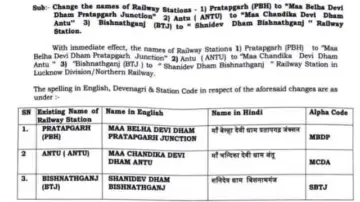 उत्तर प्रदेश के तीन रेलवे स्टेशनों के नाम बदल दिए गए हैं। उत्तर रेलवे ने इसके लिए नोटिफिकेशन जारी कर दिया है। नोटिफिकेशन के मुताबिक प्रतापगढ़ स्टेशन को अब मां बेल्हा देवी धाम प्रतापगढ़ जंक्शन के नाम से जाना जाएगा।